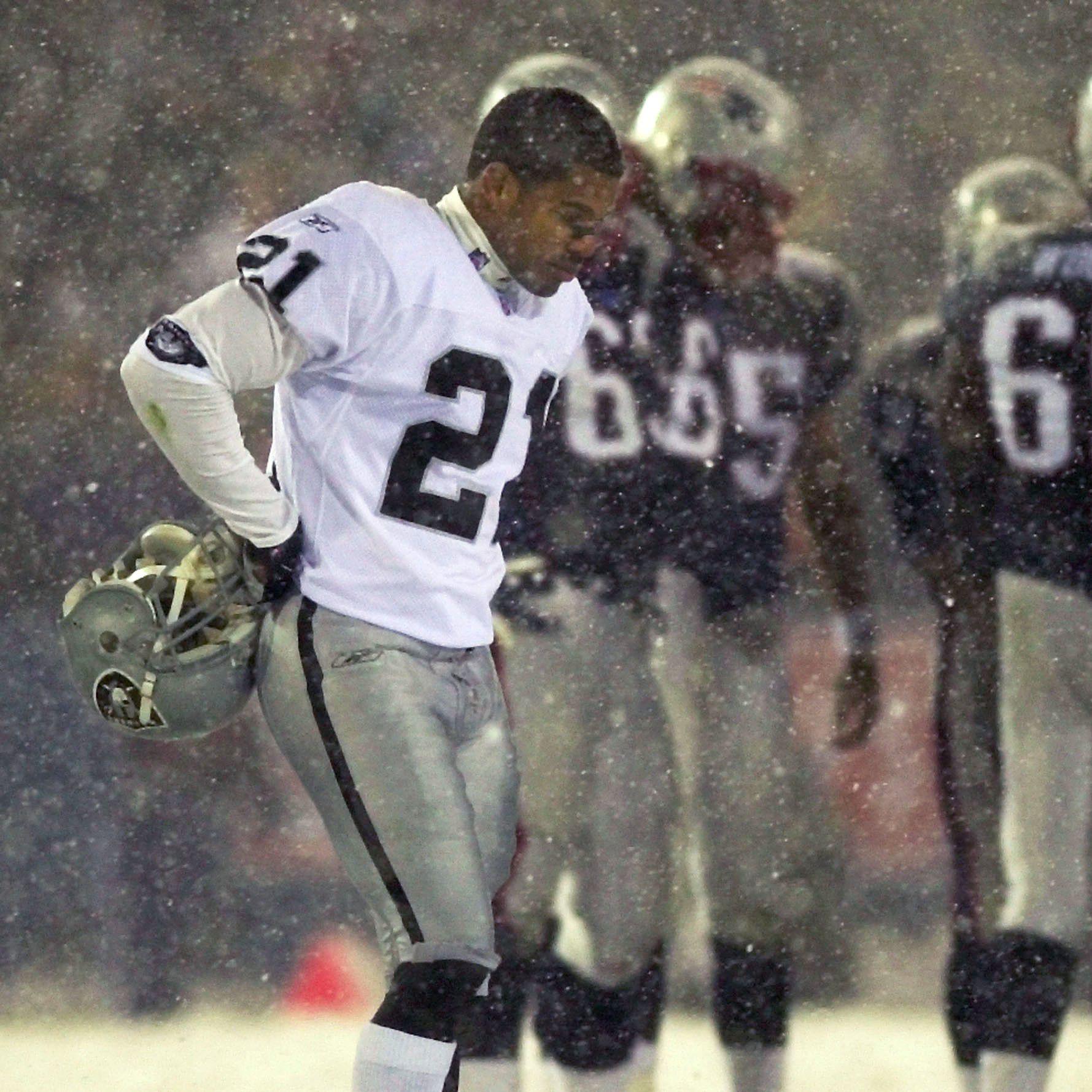 Walter: We were messing around with shoes to wear, and luckily they had the old [heating] coils under the field so there was footing underneath the snow. And the snow was kind of fluffy. But I remember at halftime [Oakland punter] Shane Lechler and I trying to practice, and we were literally laughing out loud. Some punts we would launch, and some we’d slide forward and hit the damn thing off our shin. We’re like, “Bro, this game needs to be over.”