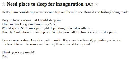 Another fact: The city of Washington, D.C., and much of its immediate environs is notably liberal; in November, 90.5 percent of Washington voters cast their ballot for Hillary Clinton. Trump came out with just 4.1 percent. With droves of Trump supporters pouring into the city and seeking lodging, it’d be reasonable to expect some friction on the laissez-faire rental market.