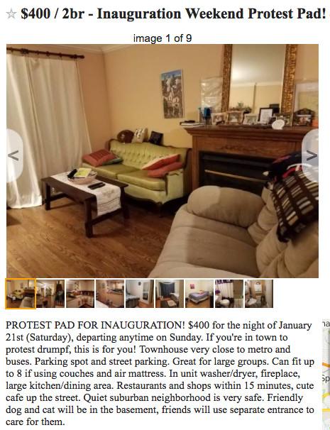 Some hypotheses here: First, an awful lot of people will be coming to town, and it’s reasonable to assume that an awful lot of D.C. dwellers stand to make an awful lot of cash off their visits. And second, those would-be temporary landlords probably have some strong opinions about which event — inauguration or march — their would-be renters plan on attending. Basically: Big trouble in little renters’ market.