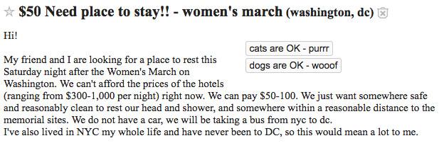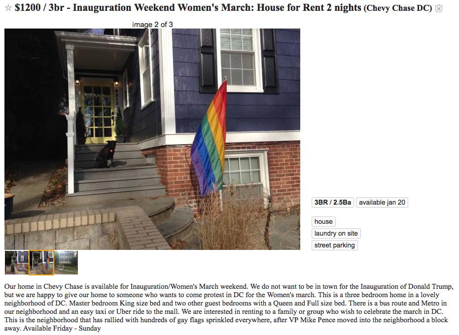 Gordon posted an ad on Craigslist looking for visitors — with a pointed caveat: “We do not want to be in town for the inauguration of Donald Trump,” he wrote, “but we are happy to give our home to someone who wants to come protest in D.C. for the Women’s March.”