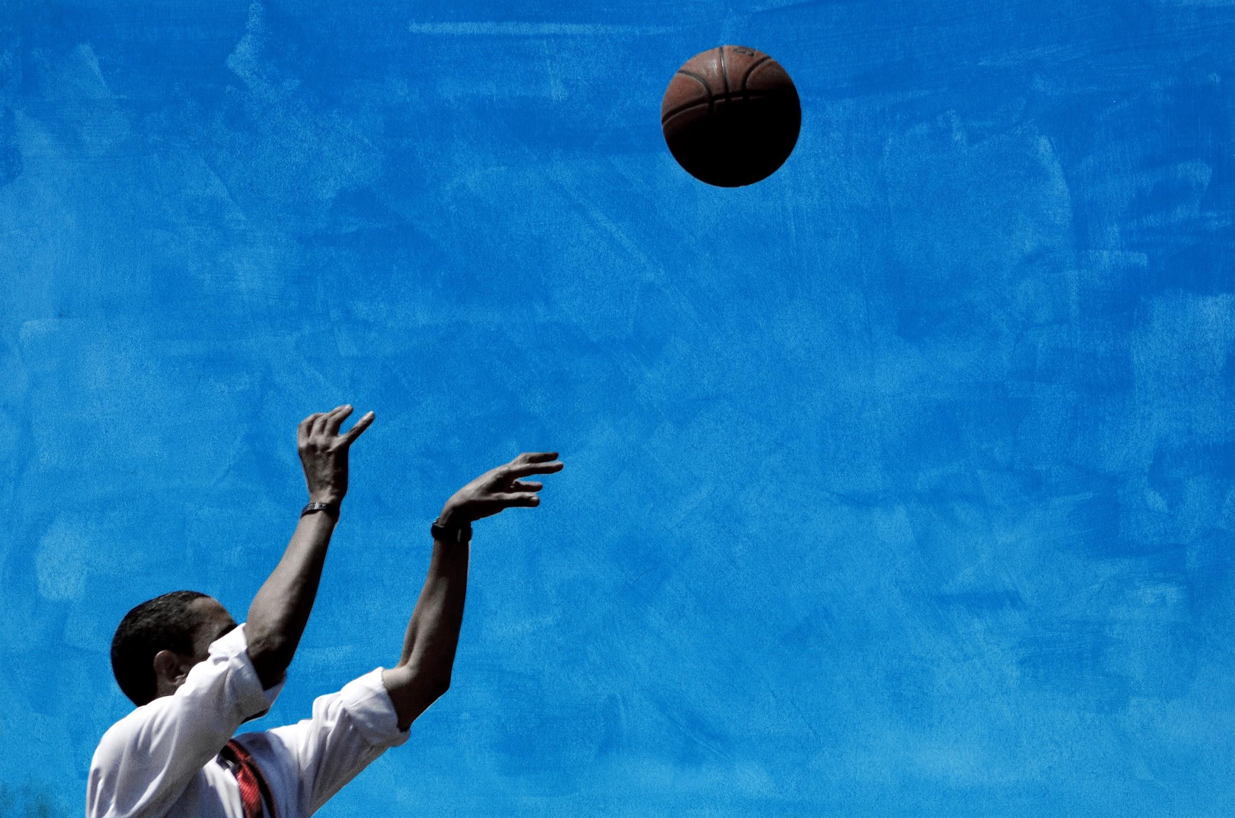 All of this was orchestrated by someone who didn’t have even a significant high-school basketball career. During a 2008 campaign stop in Kuwait, Obama addressed troops on a court. Then he walked a basketball up to just outside the 3-point line. “I may not make the first one,” he said. “But I’ll make one eventually.” He let go of the ball, it went through the net, and Obama stuck both hands up in the air.