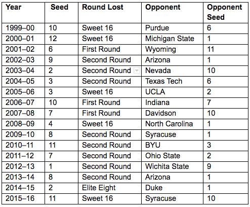Here’s the thing about that type of thinking, though: Gonzaga doesn’t actually have a terrible tournament history. This is my biggest pet peeve with all of the talk that surrounds the Zags. If you’ve watched the current iteration of this team and still think it sucks, fine. But if you refuse to watch it because you’re in the Gonzaga-always-chokes-in-March-so-why-bother crowd, then it’s time for a little history lesson. Here’s a rundown of head coach Mark Few’s NCAA tournament appearances: