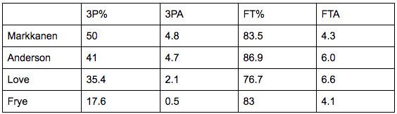 No matter how bad he is at defense, though, Markkanen’s offense is going to make him very valuable as a pro. Few big men have ever been as prolific from distance as Markkanen in college. He boasts an absurd 67.6 true shooting percentage, which is particularly notable considering 45.3 percent of his attempts come from 3. He seemingly never misses open shots, and he has an incredibly quick release that means he doesn’t need much (if any) space to feel comfortable taking the jumper. Look at his shooting numbers in comparison to Channing Frye, Kevin Love, and Ryan Anderson when they were in their final seasons in school: