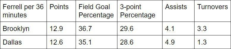 Ferrell had a 10-game stint with the Nets earlier in the season, and his play with the Mavs is the closest thing to a controlled experiment that you will see in the NBA. If you prorate his playing time over 36 minutes, he’s the same player he was in Brooklyn, except he’s doing a much better job of taking care of the basketball.