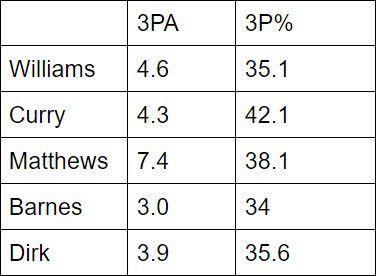 In a league where point guard play is more important than ever, it hasn’t mattered that much who has been running point for the Mavs. In the 98 minutes when Williams has played with Curry, Matthews, Barnes, and Nowitzki this season, the Mavs have an offensive rating of 111.8. In the 44 minutes when Ferrell has played for Williams, they have an offensive rating of 107.7. That’s the power that floor spacing can provide.