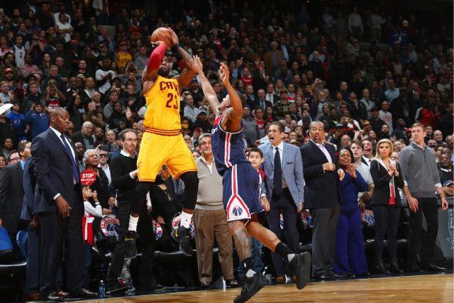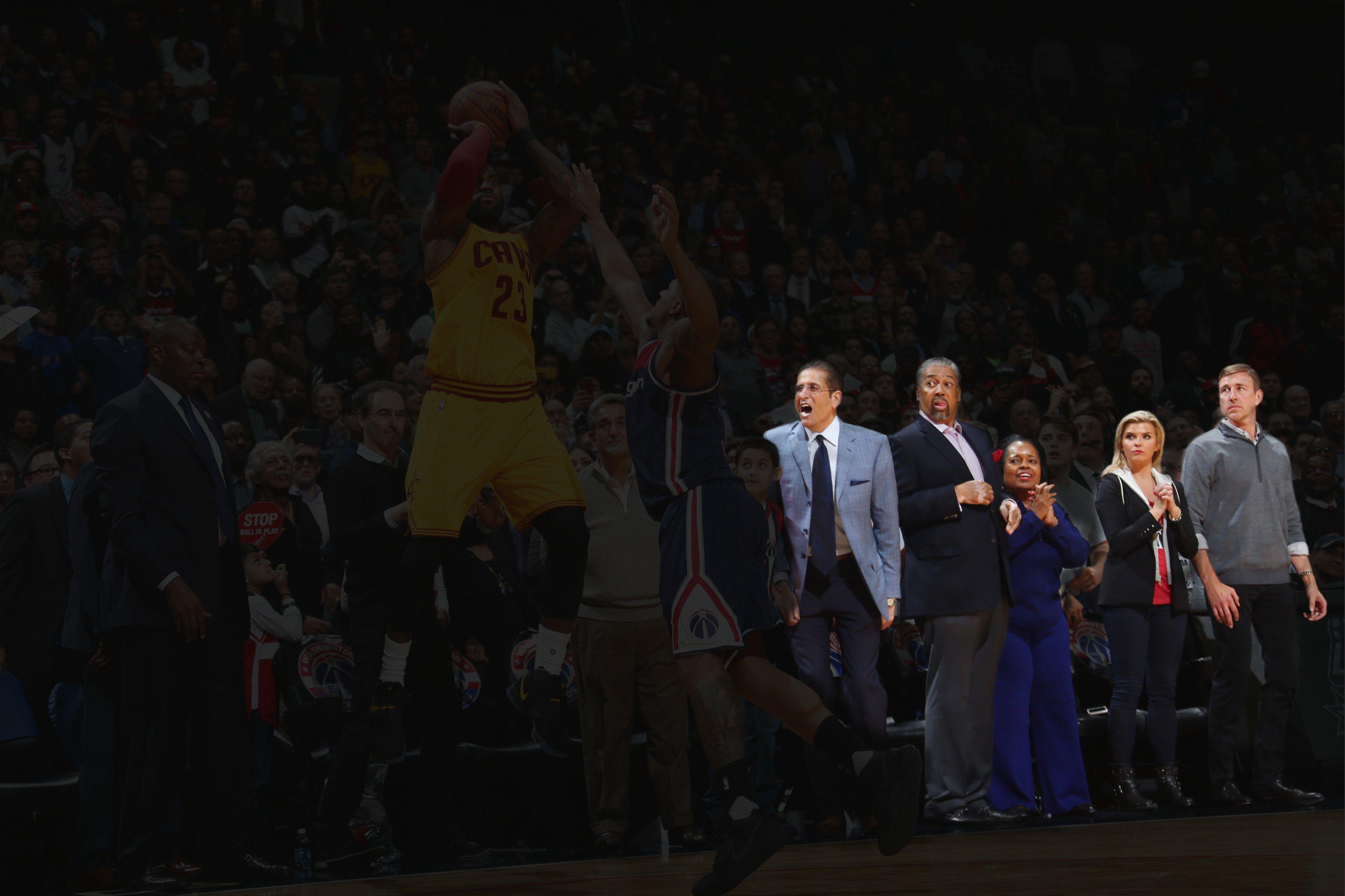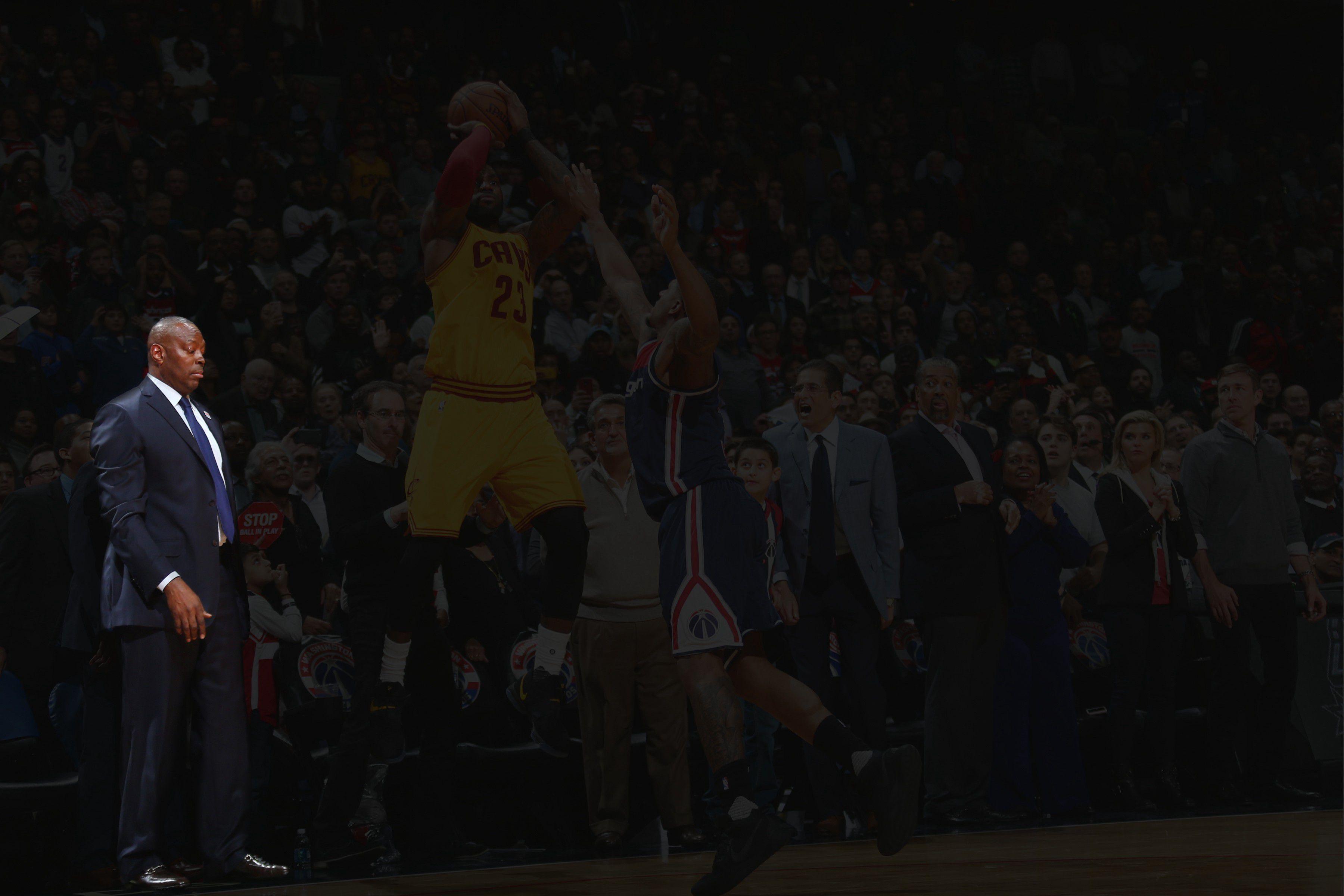 On Monday night, the Cavs and the Wizards played, and it was a very good game marked by a very excellent moment: With 3.4 seconds left, Kevin Love, the archangel of the outlet pass, grabbed the ball following a made free throw, then chest-passed it some 75 feet to LeBron James, who caught it and did an amazing thing. That amazing thing — a falling-out-of-bounds 3 that tied the game with 0.3 seconds left — made for a great highlight video. But it made for an even better photograph: