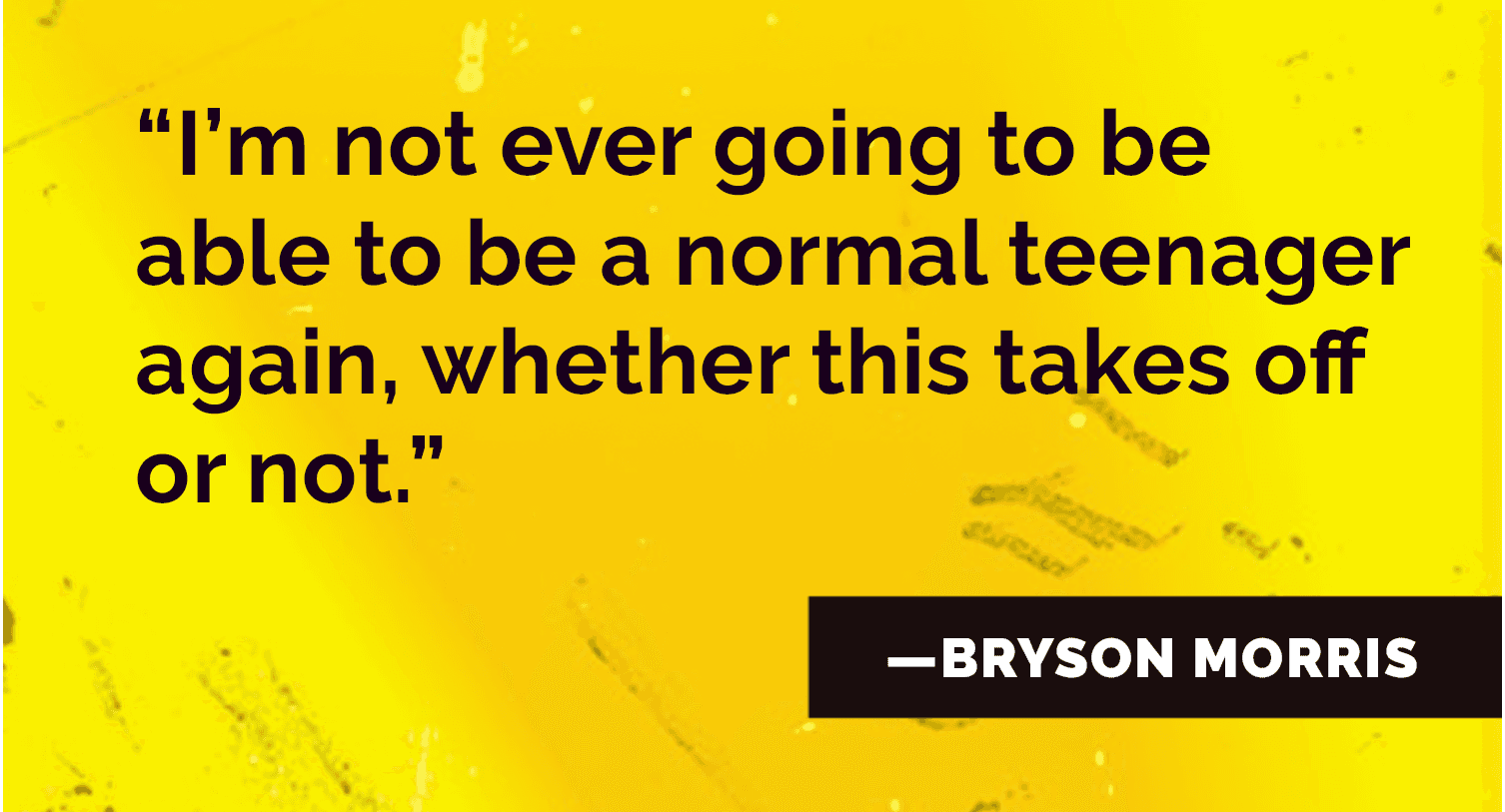 Bryson says he’s unbothered by operating in the odd space in between adolescent anonymity and music fame. Home-schooling, in particular, isn’t a worry. "I just get up, and I go to my little section where I’ve got my laptop, and I watch my classes. It’s the same thing as going to school; it’s just like I’m watching it through a computer screen," he says, a bit confused about why we’re discussing academics. "It’s a classroom, there’s students there, there’s teachers and everything, and they’re just recording it. It’s just like you’re in school, it’s just on the computer screen."