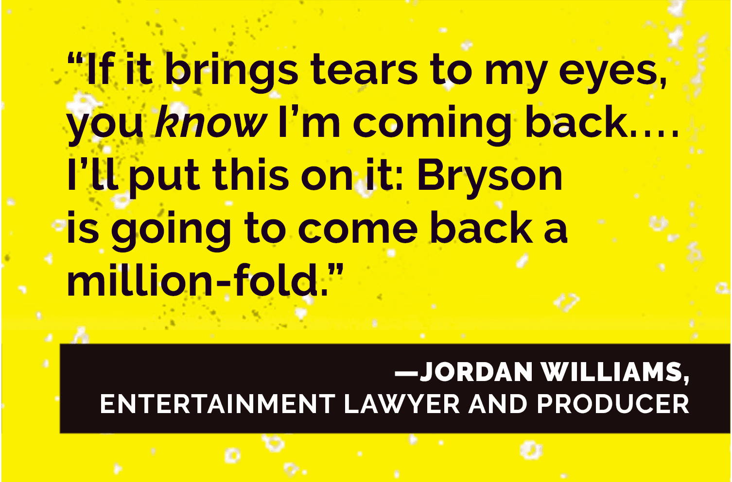 "It’s sickening," said Williams about Aviles’s work. "The key to our success. We have to have a good product, but Hugo is the key. That’s the wild card. Because he understands the matrix and the analytics. And how to go inside of [Bryson’s] demographic, his following, and manipulate that."