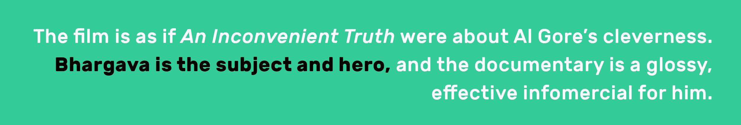 “There are 7 billion of us in the world today,” Bhargava intones over the film’s opening shot. It shows him walking through a cavernous warehouse, equipment whirring in the background. He stands on a balcony and overlooks the space. “Awareness doesn’t reduce pollution, or grow food, or heal the sick. That takes doing.” The production team didn’t add a CGI halo into the frames, but it would’ve fit with the theme. He presides over the innovation like a TED Talk incarnate.