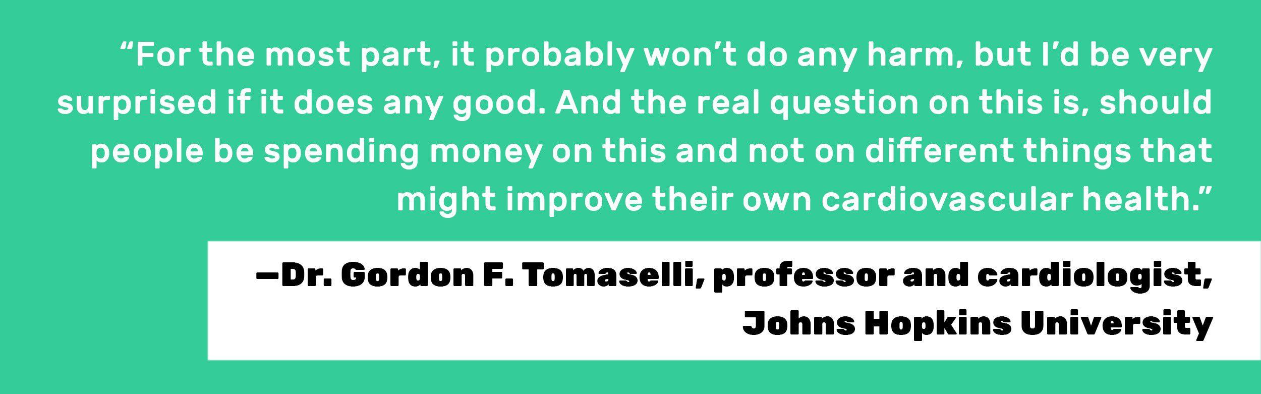 “For the most part, it probably won’t do any harm, but I’d be very surprised if it does any good,” Tomaselli told me. “And the real question on this is, should people be spending money on this and not on different things that might improve their own cardiovascular health.”