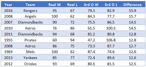 Unless that team is the 2016 Rangers. The Rangers outscored their opponents by only eight runs, but they won 28 times more than they lost.