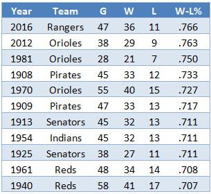 Partly as a result, the Rangers recorded the best-ever winning percentage in one-run games, the outcomes of which are largely independent of team quality.
