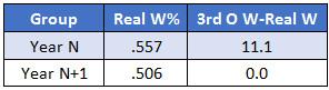 If we take the 50 teams with the biggest differences between their actual and third-order records (excluding 2016), we find that they bested their third-order records by 11.1 wins, on average. As one would expect, given that large an advantage, those teams tended to do well, averaging a .557 winning percentage — a 90-win pace over a 162-game schedule. But in the season immediately following those 50 teams’ big third-order overperformances, the difference between their actual and estimated records was completely wiped away; they won exactly as often as their stats said they should. And with that good luck or good timing eliminated, they lost, on average, eight wins over a 162-game season, just as the Orioles did from 2012 to 2013.