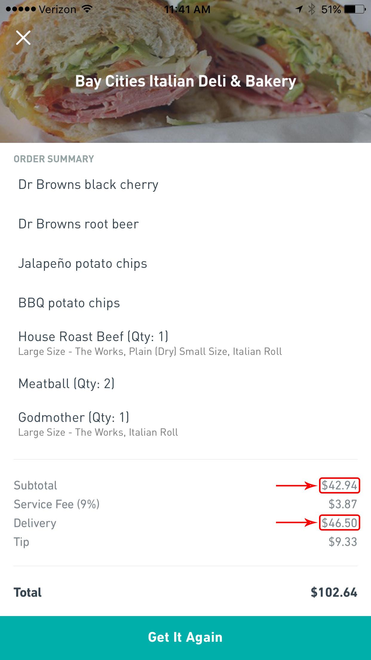 Yes, that’s a surge-price-inflated delivery fee that’s more than the cost of the actual order. No, it was not the last time we partook in Bay Cities.