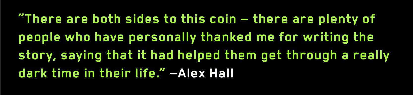 Katelyn’s death left Hall reconsidering his creation and pondering issues of authorial responsibility.