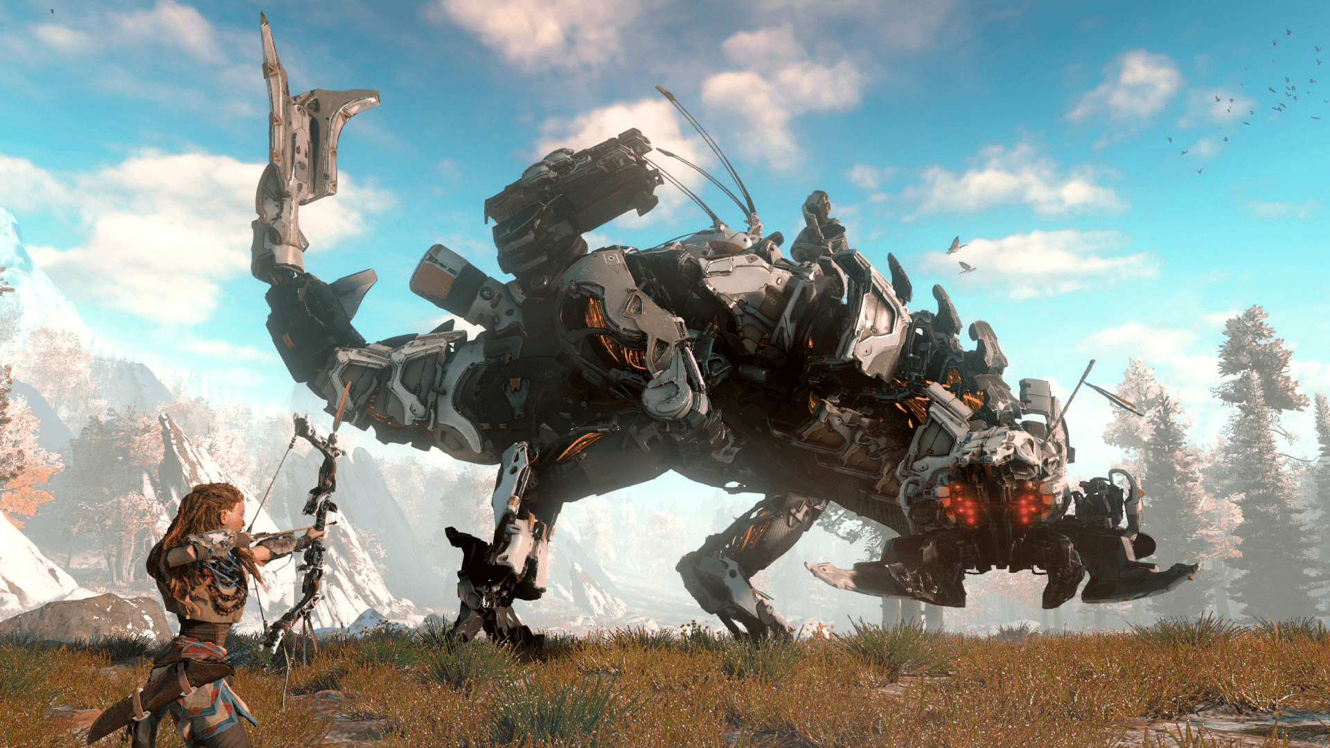 There’s the watcher, a bipedal reptile bot the size of a pony with a long tail and a telescope lens for an eye. The strider and the broadhead, which can be hacked and used as transportation, are analogous to horses and cattle, respectively. Sawtooths are sabretooth tigers. Stormhawks are birds of prey the size of small aircraft. Tallnecks are docile brontosauruses with flat heads and climbable necks. Rockbreakers are worms the size of cruise ships that erupt from the earth and spit boulders at you.