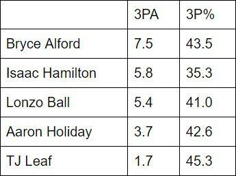 Ball would be great no matter where he played, but the skill sets of his teammates have allowed him to be transcendent. Look at the 3-point-shooting numbers of UCLA’s top perimeter players: