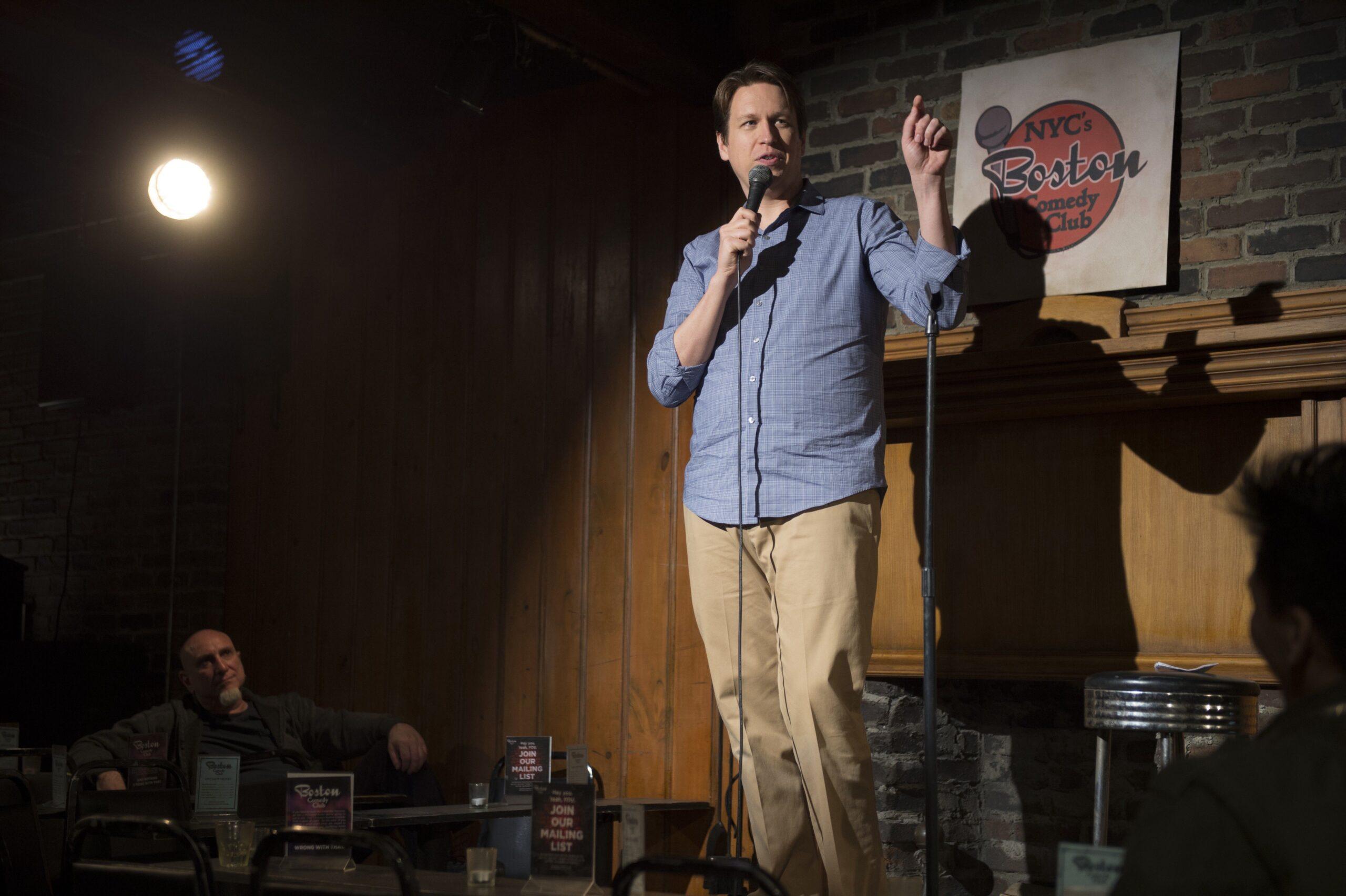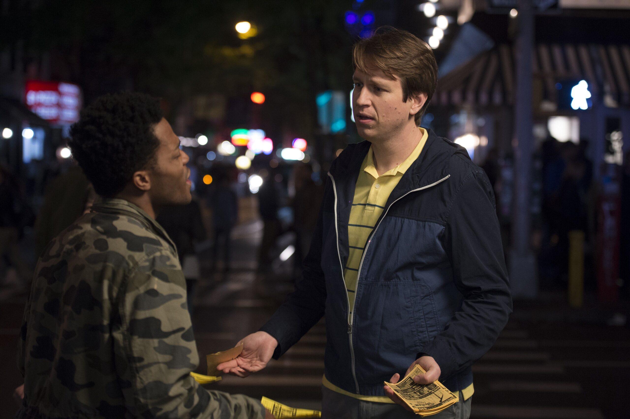 That same contradiction drives Holmes’s appeal as a performer. He’s not a clean comic in the vein of Mike Birbiglia or Jim Gaffigan, and his optimism doesn’t stand out in the current landscape as much as it once might have. (A New York Times trend piece on “sweet-tempered stand-up” name-checks him alongside a half dozen colleagues, including Ron Funches and Josh Gondelman.) But the novelty of a person like Holmes ending up on a place like the Manhattan open-mic circuit is instantly apparent in episodes like “Barking,” where his character beseeches Greenwich Village tourists to come to a comedy club in the hopes of earning five minutes onstage. “People would think I was on drugs or there was something wrong with me or I was mentally unstable because I was so happy to just be handing out fliers in exchange for stage time,” he says. “That was real.”