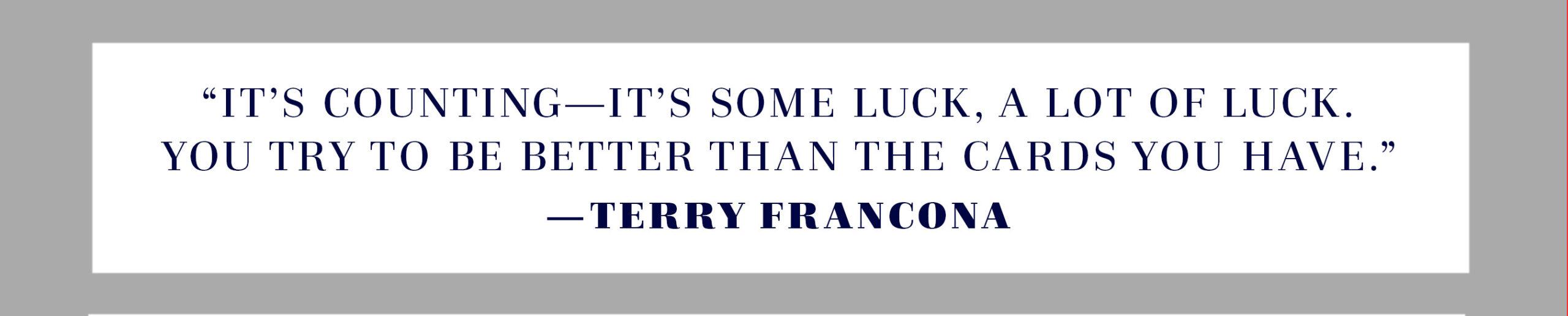All this time spent around ballplayers led to parallel obsessions with baseball and cribbage. Francona is fiercely uncompromising when it comes to both, and it’s no coincidence that Brad Mills — Francona’s bench coach in Cleveland, and a man who has played and worked alongside him for decades — mostly refuses to engage him in a casual game of cards. "He frustrates the daylights out of me," says Mills, who accuses Francona of playing much too fast. "I like to enjoy playing. He loves to frustrate me. He’s always been that way."