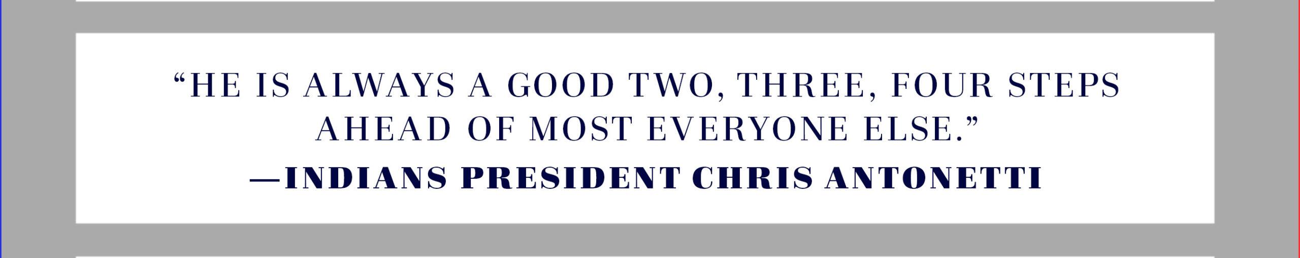 Antonetti says that when Francona came in to interview for manager in 2012, "it would have been very easy for someone of Tito’s accomplishments, his résumé, his success, to just say, ‘Hey, this is me, here I am.’ And he approached that process the exact opposite. He actually took the time to write out six or seven pages of things that were important to him." Judging by the things Francona says and does, those things include a young corps, an active front office, and a long leash. Francona got the job, and in his first season, he won AL manager of the year. The Indians earned a wild-card berth, then broke their new manager’s heart.