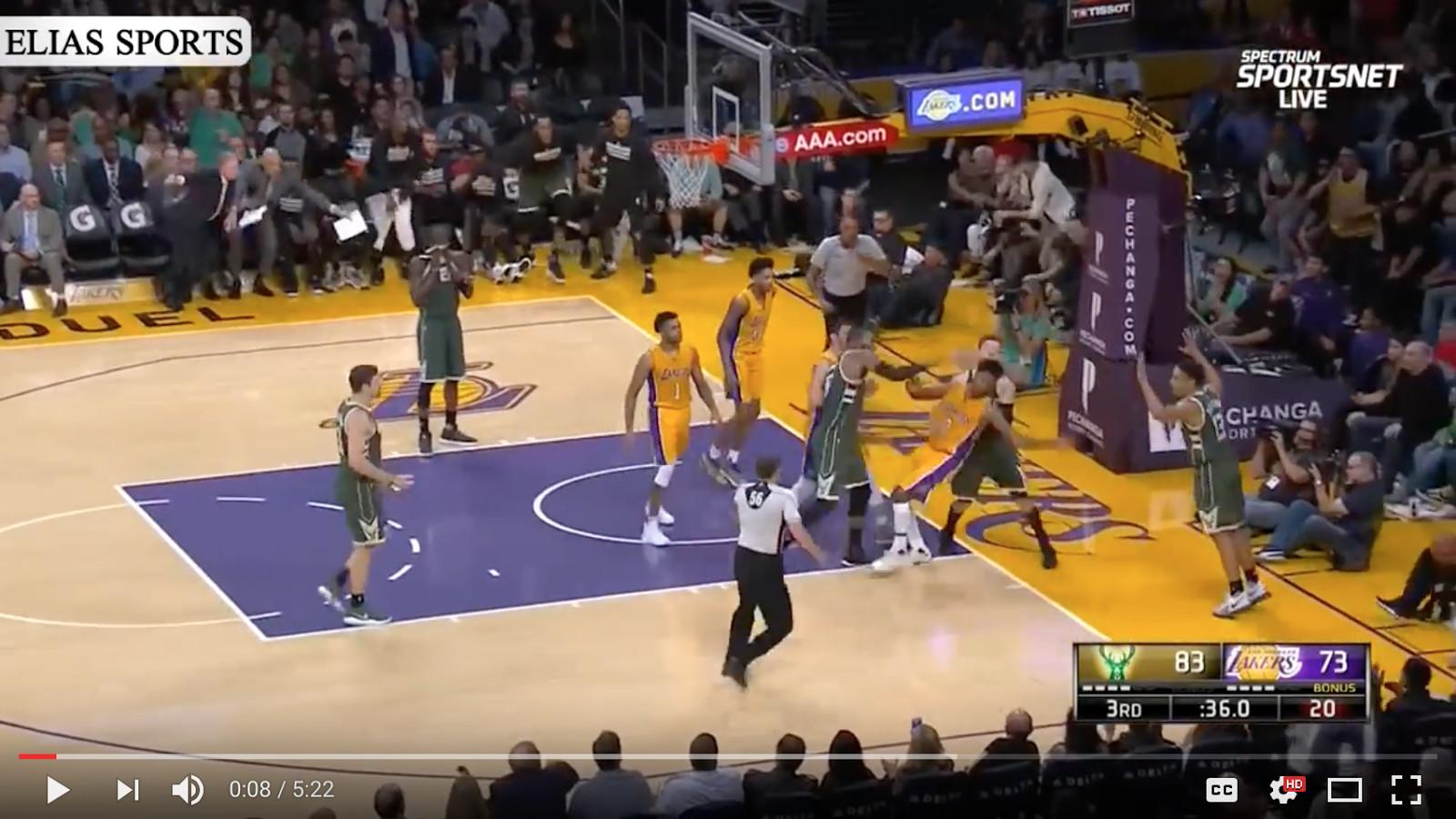 The Infraction and Fine: Nearing the end of the third quarter of a game between the Milwaukee Bucks and the Los Angeles Lakers on Friday, the Lakers sprinted out on a four-on-one fast break. Brandon Ingram, currently my favorite NBA player based on those magic brooms from Disney’s Fantasia, drew in the defender (Malcolm Brogdon) and then scooped the ball over to Nick Young for an easy layup. On the layup attempt, though, Brogdon whopped Young while trying to block the shot, to which Young responded by shoving him, to which Bucks center Greg Monroe responded by shoving Young by the throat, to which Lakers guard D’Angelo Russell responded by shoving Monroe in the back, to which I responded with, “Fiiiiiiiiiiiiiiiiiiiight,” while I watched the game at home. The NBA fined Monroe $35,000, Nick $25,000, D’Angelo $15,000, and me $0.