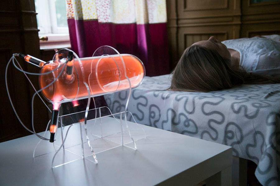 Before meeting my aura-massage-endorsing pal, I met Roger Green, a congenial salesman with a trace of a New Zealand accent, who evangelizes the Theraphi as part of a many-pronged approach to selling wellness. (He later gave me a brochure for the anti-aging pills he shills.) Green led me through the Alchemist Kitchen’s lower level, past an organic wine bar, a “cryo-facial” center, a set of infrared saunas, and a sign that read “drip alchemy,” into a sparse back cubby furnished with the Theraphi and a bench. The Theraphi was created by a duo of unconventional inventors, researcher Paul Harris and former IBM systems analyst Dan Winter, and it looks like a massage station sandwiched between delicate steampunk art pieces. A modified Tesla coil and switch system are hidden underneath its blanket-covered table. Two large, oblong glass lights sit on end tables at the head and the foot of the massage station. When the machine is switched on, the noble gases inside form a glowing plasma. It promises a “full body recharge” for people who lie in between its lights. It makes grandiose claims about the ability to reduce swelling, heal wounds, enhance cancer remission, and reduce the effects of aging. Right now, there are only around 30 to 40 either in existence or in production, so the treatment is still a rarity in the wellness world, with devices scattered around the U.S. and Europe.