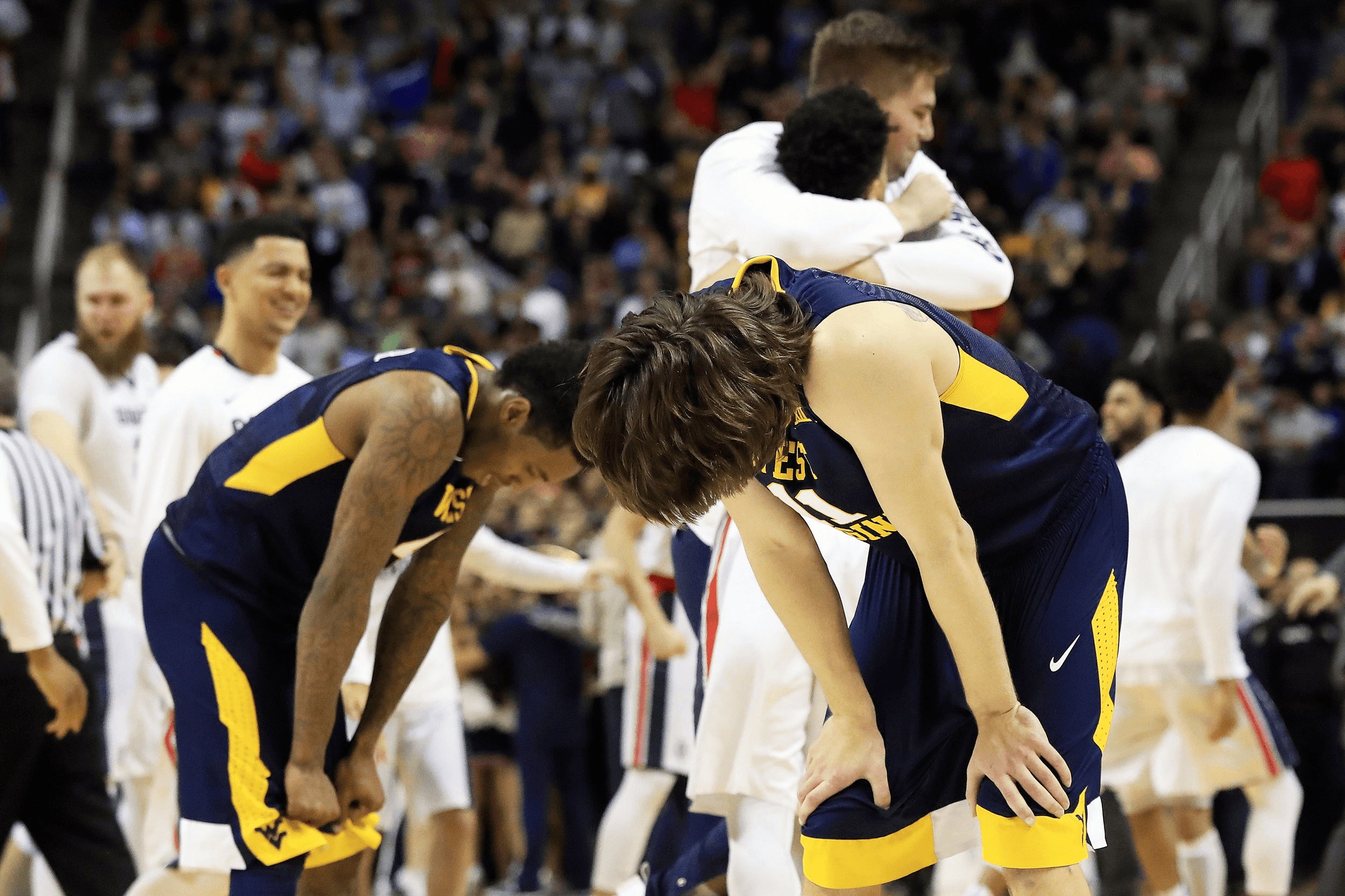 Jevon Carter attempted a tightly contested 3-pointer from the right corner, which he airballed. The Mountaineers grabbed the rebound, and then Carter attempted a deeper, even more tightly contested 3, which somehow hit the rim. After WVU’s Nathan Adrian secured the board and dished the ball back to Carter, he dribbled for about 11 seconds before beginning to attempt a 37-footer, realizing he was too heavily guarded, and passing to Daxter Miles Jr., who flung the ball hopelessly at the rim after the clock had expired. Gonzaga prevailed 61–58 to advance to the Elite Eight.