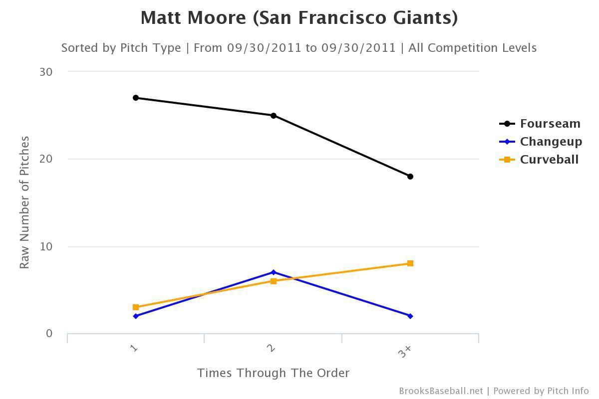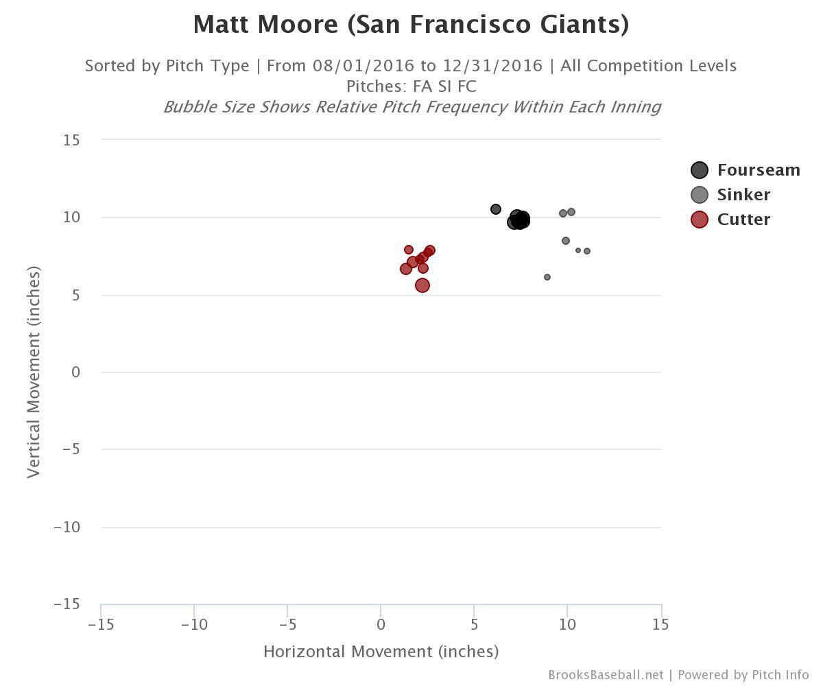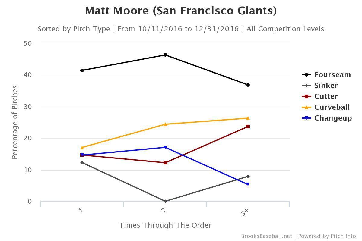 Moore doesn’t think of the trade to San Francisco as a new chapter in his career (“I mean, I didn’t choose it, right?” he said), but in his first weeks with the Giants, he had what can only be described as a watershed moment. Let’s take a look at his pitch usage from that 2016 playoff start.