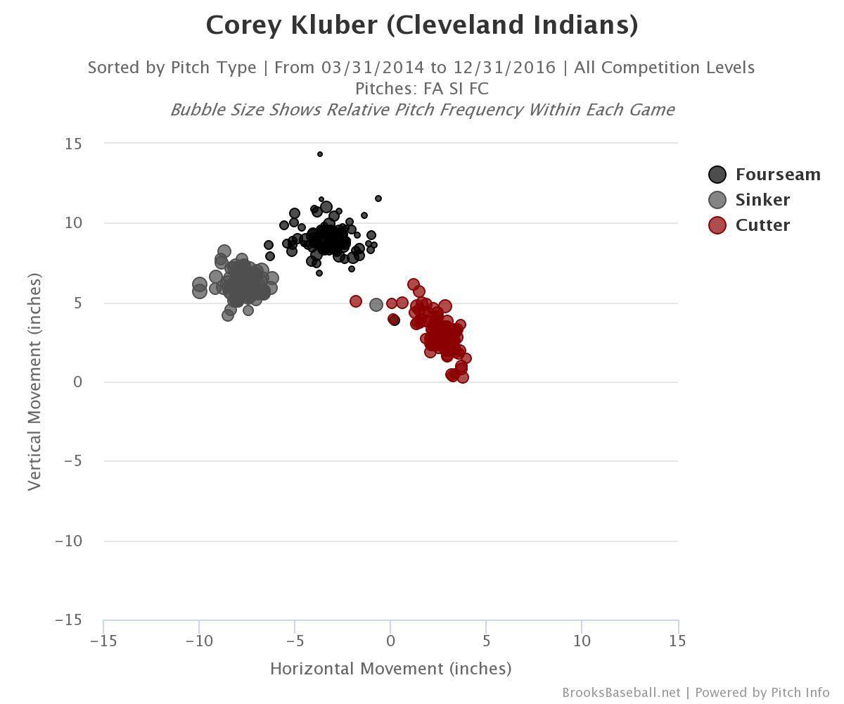 The second is that he throws three different fastballs — a four-seamer, a sinker, and a cutter — in proportions that vary wildly from month to month, and while they all come in somewhere between 90 and 94 mph, hitters can’t tell which way they’re going to break. Here’s the movement on Kluber’s fastballs since 2014, when he won the Cy Young.