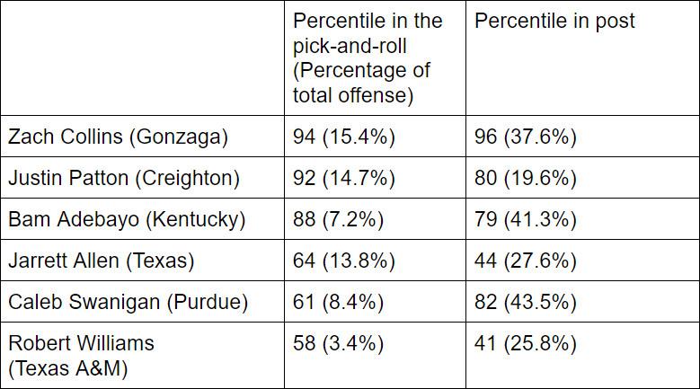 All of these big men post up more often than they play in the pick-and-roll, which is one of the things that makes evaluating them for the next level so tricky. The small-ball revolution hasn’t quite trickled down to the college game just yet.