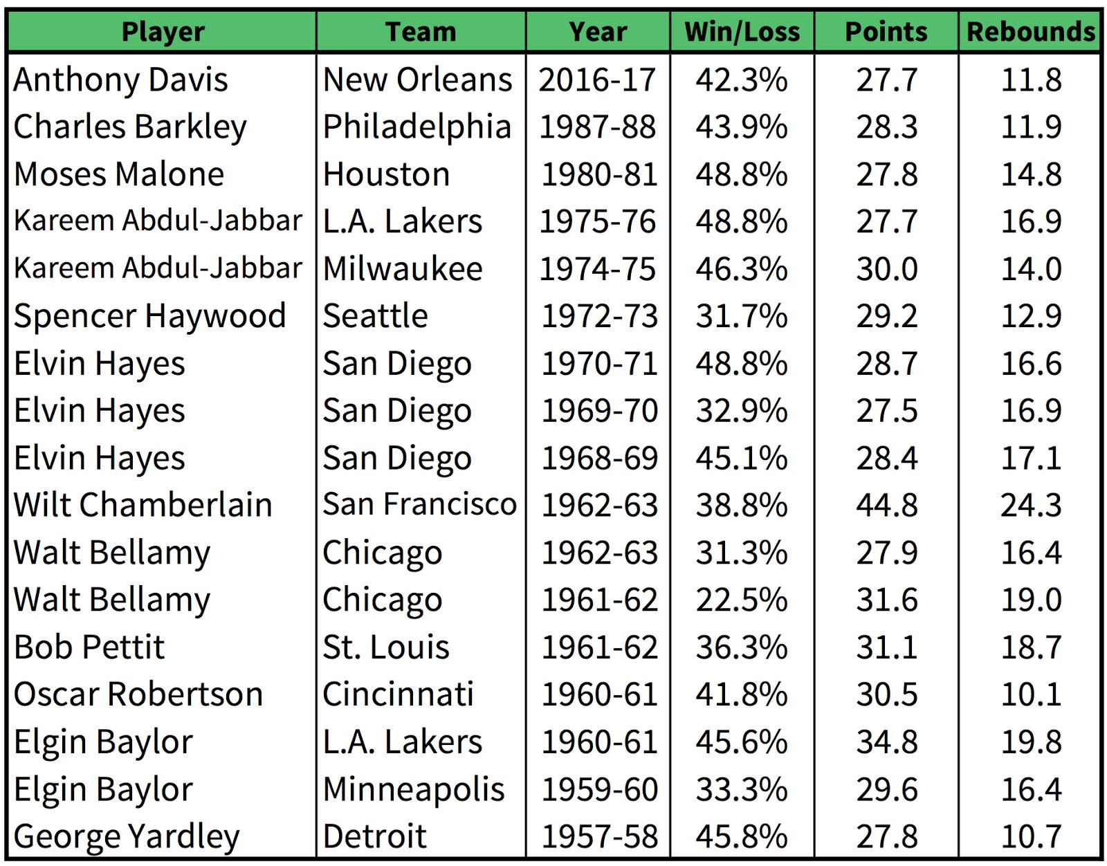 The last time a season like this occurred was nearly 30 years ago, when Charles Barkley averaged 28.3 points and 11.9 rebounds for the 36-win Sixers in 1987–88. Most of the other instances come from the 1960s. Here’s the list:
