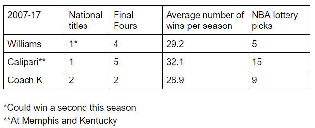 Let’s compare what Williams, Calipari, and Duke coach Mike Krzyzewski have done over the last decade.