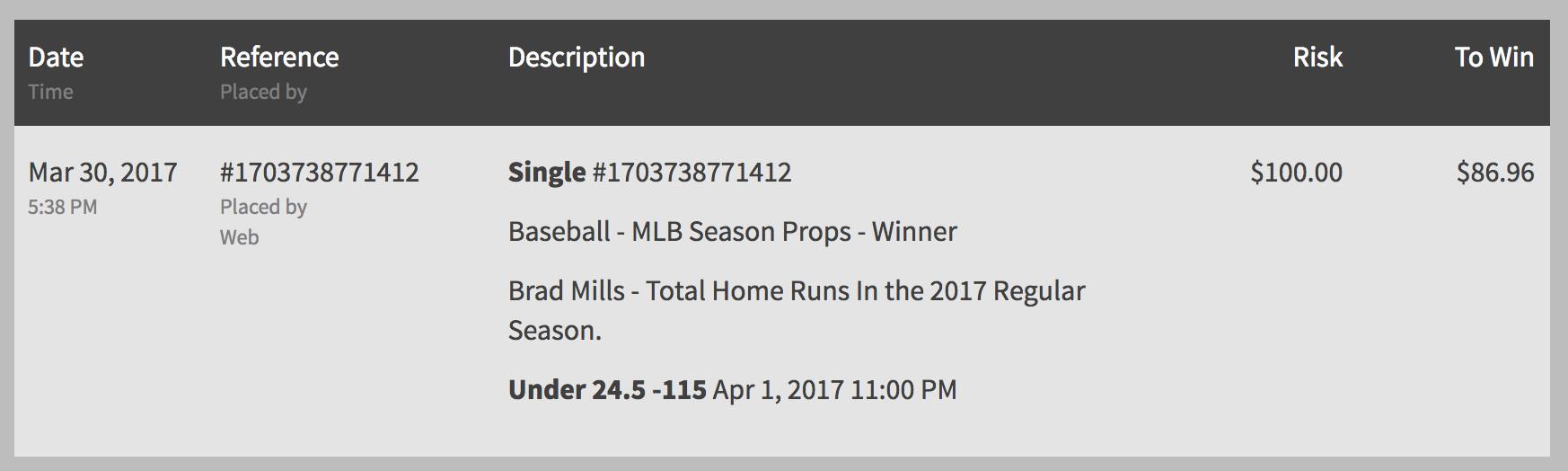 So here’s how this could play out: If Bovada honors the bet but Brad Mills, the pitcher, doesn’t make the majors this year, the bet would be invalid. If he does — and he doesn’t pull a Rick Ankiel or become the best-hitting pitcher of all time — I could conceivably claim that I’ve earned my $86.96. After all, there’s no way to know that the bet wasn’t supposed to be about Brad Mills.