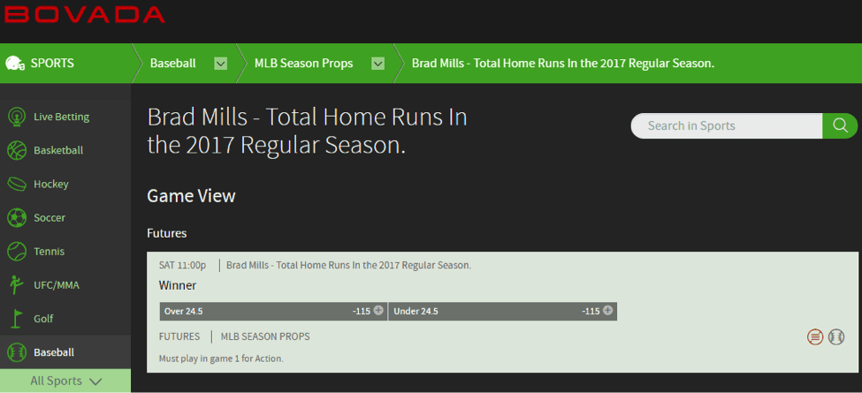 If you scroll down, right between Billy Hamilton and Brandon Belt, you will, as of this writing, find an over/under on home runs hit by Brad Mills, which is set at 24.5.