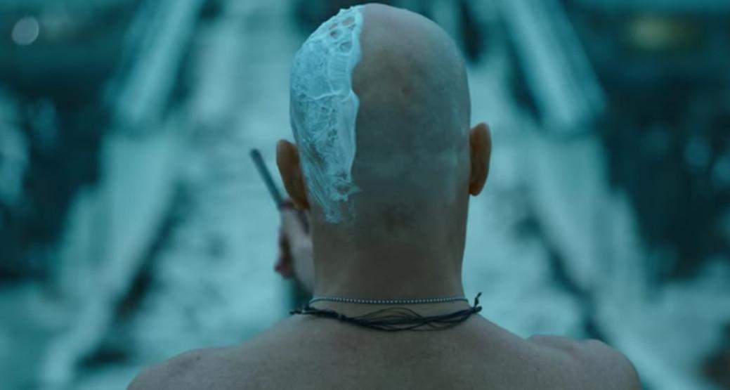 Here is a shirtless Woody Harrelson, who plays the commander of the ape-hunting human army, crossing himself with a straight razor while using that razor to shave his head: