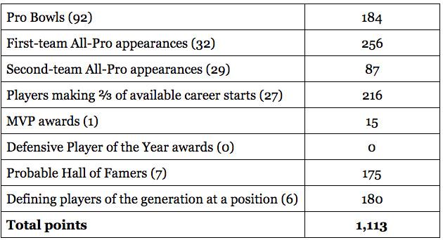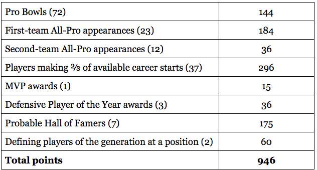 Despite the presence of guys like Smith, Julio Jones, and Peterson, though, Watt is responsible for a good chunk of the points in this draft. The system credits him with 139 total points (if we concede that he’s on a Hall of Fame track and is the defining defensive lineman of this generation, both of which I’d contend are true). The 2011 class has its own version of Yanda — a late-round gem who deserves mention alongside the guys from the top 10 — in Richard Sherman. Considering the other defensive talent in this draft, his name here is almost unfair.