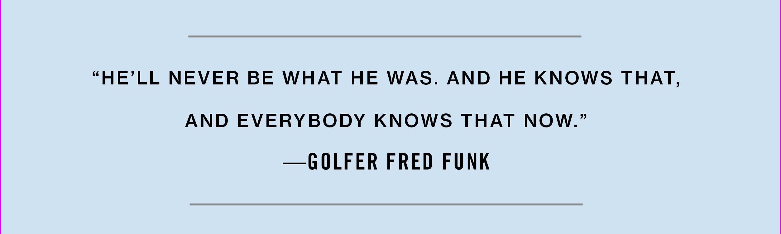 "He’ll never be what he was," Funk says. "And he knows that, and everybody knows that now. And the guys that he would have to beat now never even played against him. They don’t know. They’ve only read about Tiger."