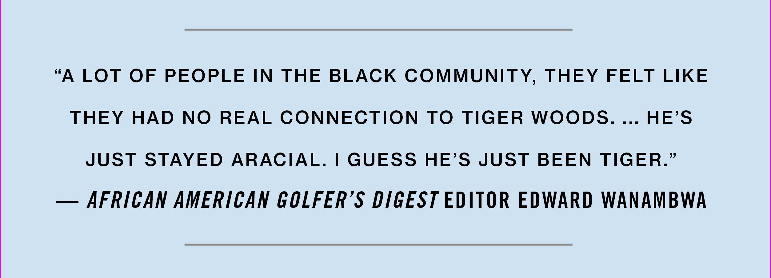 "A lot of people in the black community, they felt like they had no real connection to Tiger Woods," Wanambwa says. "So even after the fall, it was, ‘Hey, I told you that was going to happen.’ He’s just stayed aracial. I guess he’s just been Tiger."