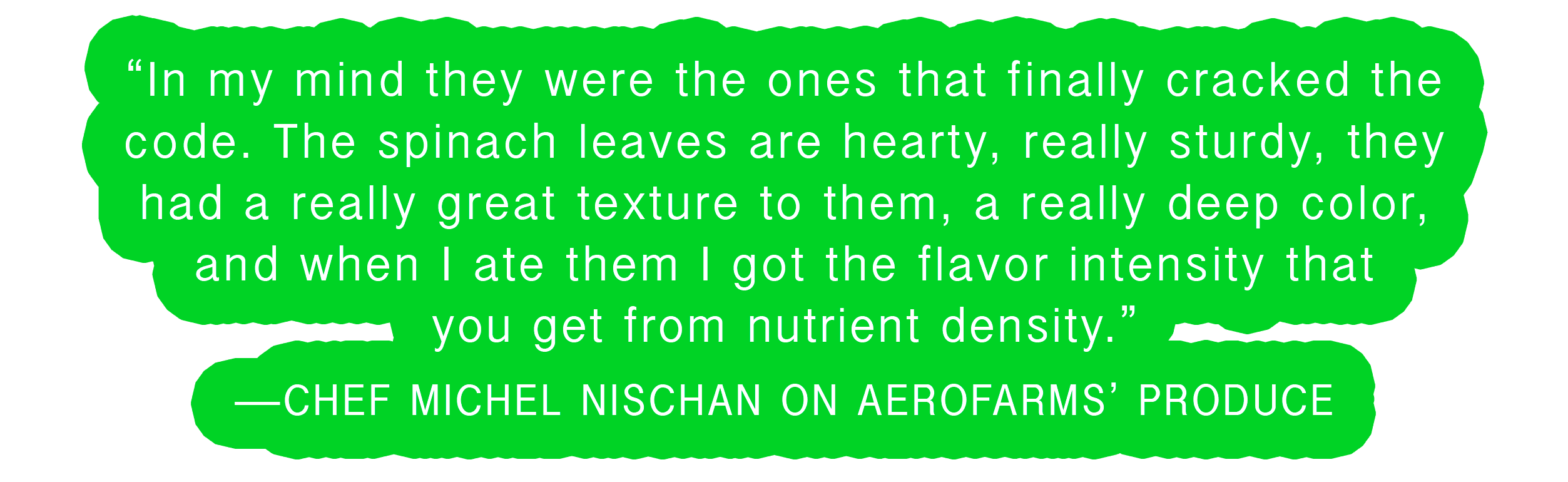 “Purely from a flavor and texture perspective, the stuff that comes out of the dirt is still superior to everything I’ve tasted, other than AeroFarms,” he said. “In my mind they were the ones that finally cracked the code. The spinach leaves are hearty, really sturdy, they had a really great texture to them, a really deep color, and when I ate them I got the flavor intensity that you get from nutrient density.”