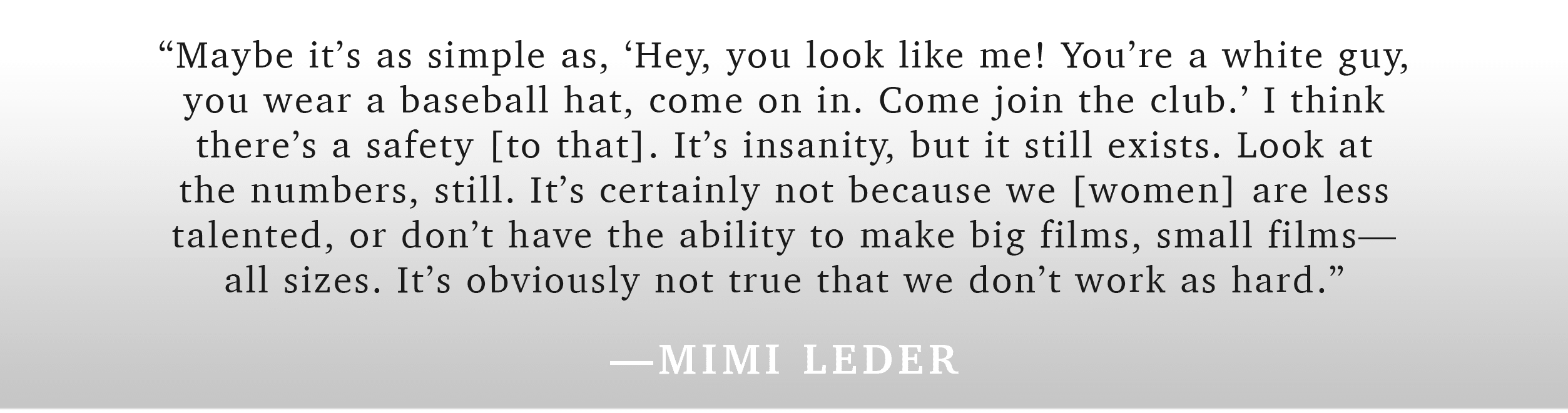 When I ask Mimi to elaborate on why she thinks this happens to female directors more than their male counterparts, she muses, “Maybe it’s as simple as, ‘Hey, you look like me! You’re a white guy, you wear a baseball hat, come on in. Come join the club.’ I think there’s a safety [to that]. It’s insanity, but it still exists. Look at the numbers, still. … It’s certainly not because we [women] are less talented, or don’t have the ability to make big films, small films — all sizes. It’s obviously not true that we don’t work as hard.”