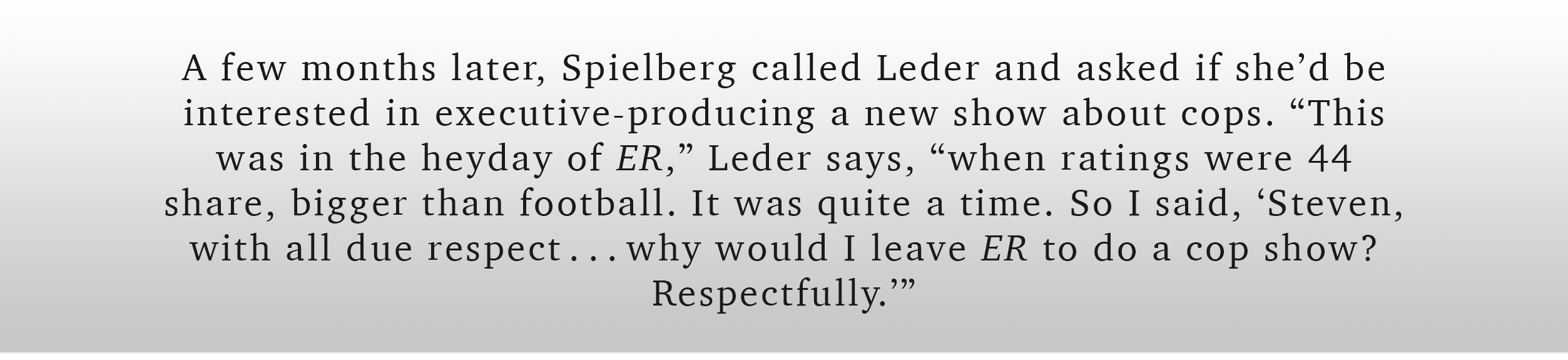 One day, she was choreographing and shooting a “six-page oner” (one scene, one shot, six pages of action and dialogue; “there was always so much pressure on the actor who had the last line not to fuck it up,” she has said) when her DP whispered into her ear, “Steven Spielberg’s in the corner over there. He’s been watching you for an hour and a half.” Leder’s stomach dropped. Spielberg’s company produced ER, but it was rare that he’d be on set. A few months later, Spielberg called Leder and asked if she’d be interested in executive-producing a new show about cops. “This was in the heyday of ER,” Leder says, “when ratings were 44 share, bigger than football. It was quite a time. So I said, ‘Steven, with all due respect … why would I leave ER to do a cop show? Respectfully.’” Turning down the most successful filmmaker of all time turned out to be quite a power move: A few months later, Spielberg called Leder back and asked if she’d consider a bigger offer, directing DreamWorks’ first feature, the George Clooney–Nicole Kidman thriller The Peacemaker.