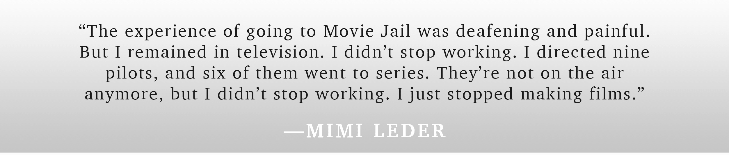 After Pay It Forward, “I did go to Movie Jail,” Leder says. “I didn’t get a movie until seven years later. I was offered lousy movies, but the point is, I know men who have made $250 million failures and they get three more films.”