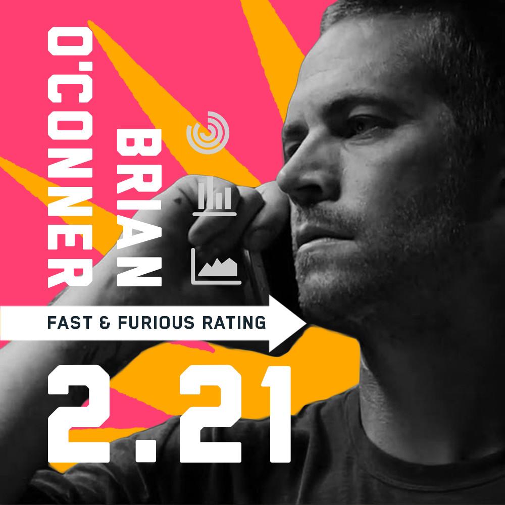 Brian was the fastest and most furious when he was in disguise as a cop in the original 2001 film, with an F&F of 3.87. Struggling to reconcile your brotherly love for Vin Diesel with your professional responsibilities and ethical mores is enough to make anyone reckless and surly. But he mostly chilled out after that, coming close to his F&F peak in only Fast & Furious, a movie in which he breaks a coworker’s face.