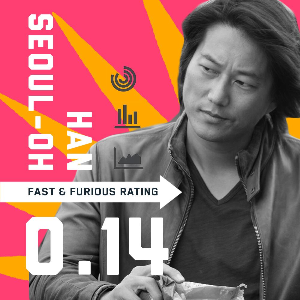 For anyone who has seen the series, it shouldn’t be a surprise that Han’s F&F is so low — he just isn’t an angry dude. But that’s what makes him so great and invaluable in these movies! You can’t have every character be a beefy guy who’s about to fury-flex out of his tank top — you also need the guy who approaches stressful situations with a wry smile and a bag of chips in his hand.