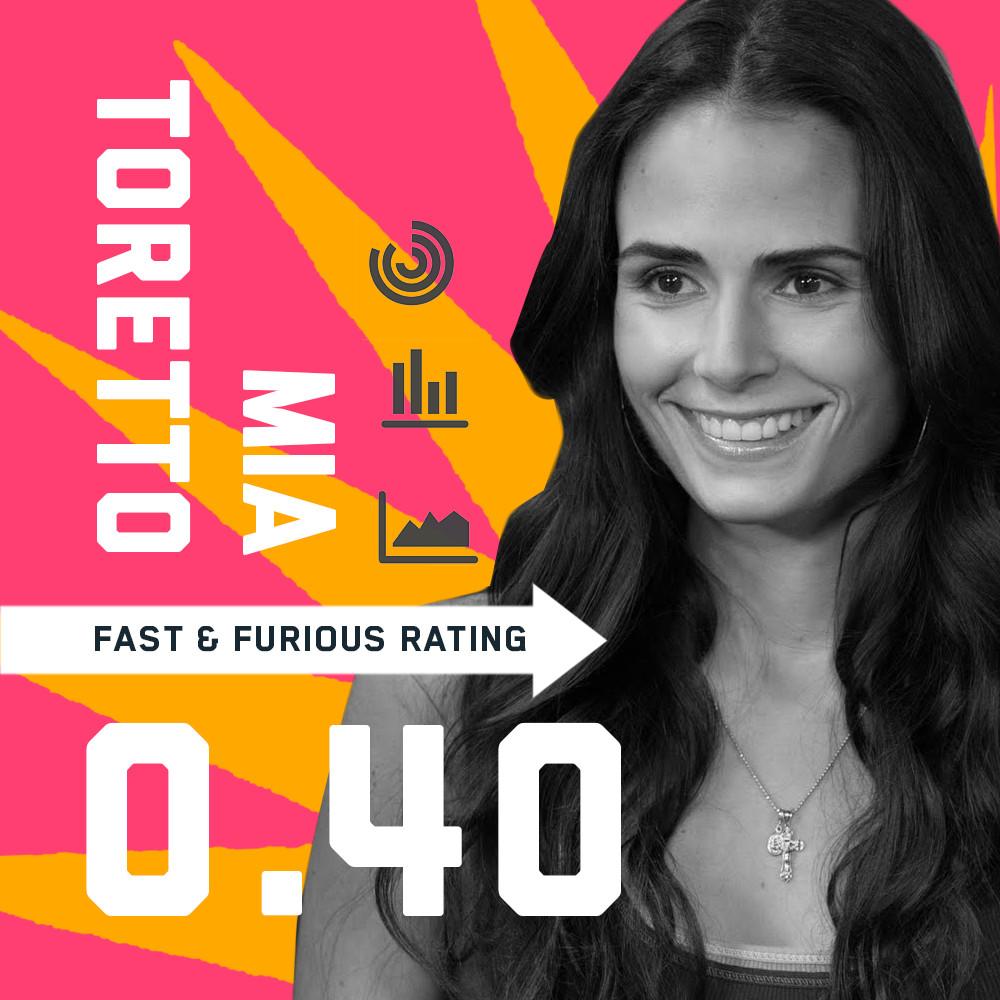 Look, nobody thought Mia was gonna win this thing. And she didn’t. She started strong, tying Brian for speediest in the original film with a 90 mph average. But once she became Brian’s beau, she slowed down to a standstill — her average mph is zero in Furious 7, because she straight-up doesn’t get to drive — and became resolutely agreeable. Though, wouldn’t we all if we were boinging young Paul Walker on a regular basis?