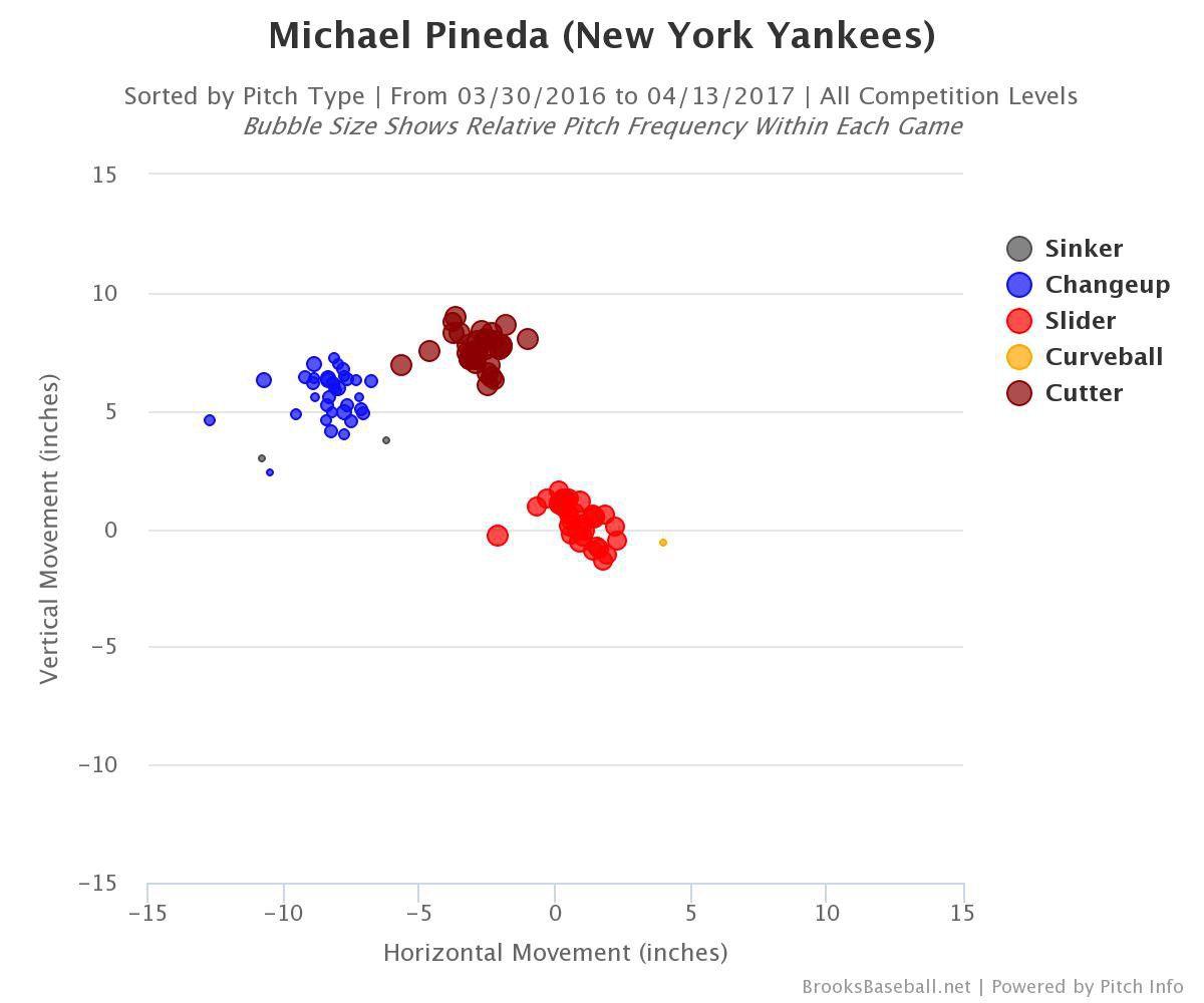 At this point in his career, Pineda’s an unconventional power pitcher. He still throws fairly hard — his fastball averages a shade under 95 miles an hour and last year topped out at 98.8 — and has a swing-and-miss slider and a changeup. The weird thing about Pineda, however, is that he doesn’t really have a pitch with glove-side break.