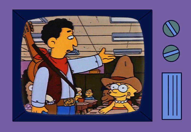 The edit helped lead to an impeccable episode. It begins with Miss Hoover announcing that she has Lyme disease. Soon Mr. Bergstrom arrives dressed like an 1830 Texas cowboy. When he asks the class to name the three things wrong with his costume, Lisa raises her hand and points out the historical inaccuracies. Despite being wrong about Jewish cowboys not existing — "There were a few Jewish cowboys," the mensch of a substitute says, "big guys who were great shots and spent money freely" — Mr. Bergstrom accepts the answers and gives her his hat as a prize. Lisa is immediately smitten by the engaging young teacher, who reads the class Charlotte’s Web and encourages the students to show off their talents.