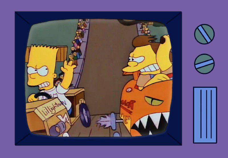 In "Saturdays of Thunder," which originally aired as the lead-in to the world premiere of Michael Jackson’s "Black or White" video, Homer seeks to improve his parenting skills and Bart attempts to defeat Nelson in the soap box derby. The dueling quests make good comedy, but what pushes the episode over the top is that it features a scene from McBain, the action movie starring Arnold Schwarzenegger clone Rainier Wolfcastle.