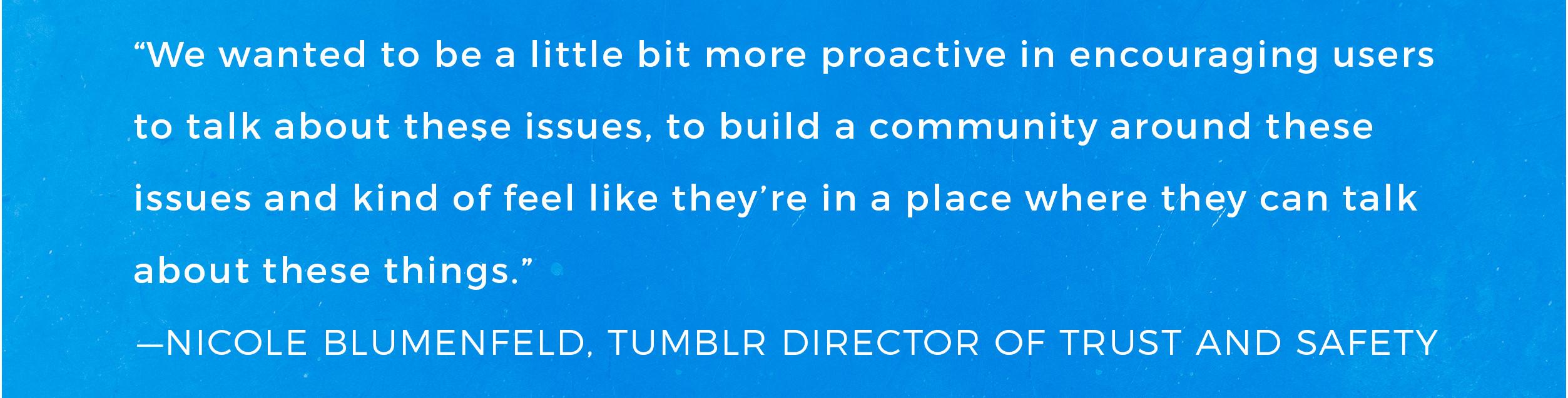 “[Alcorn’s death] maybe reminded us about how important it is for us to be involved in this space,” says Nicole Blumenfeld, Tumblr’s director of trust and safety. “It also ended up leading very much so to initiating the Post It Forward campaign, where we wanted to be a little bit more proactive in encouraging users to talk about these issues, to build a community around these issues and kind of feel like they’re in a place where they can talk about these things.”