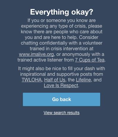 Increasingly, platforms have partnered with apps to offer vulnerable people a more personalized connection. Facebook’s partners include SAVE, National Suicide Prevention Lifeline, Forefront, and Crisis Text Line. Similarly, Tumblr refers users who are reported for suicidal content or who search for hashtags like #depression, #self-harm, and #suicide to resources including 7 Cups, and, since December 2016, mobile users are referred out to Koko.